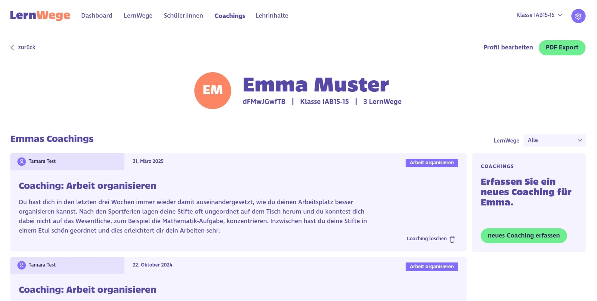 Mithilfe eines Leitfadens können Lehrpersonen Coachings zu den LernWegen durchführen, um die Schüler*innen auch ausserhalb der Plattform individuell zu fördern. Auf der Plattform lassen sich die Coachings protokollieren – so werden sie für alle Beteiligten verbindlich.
